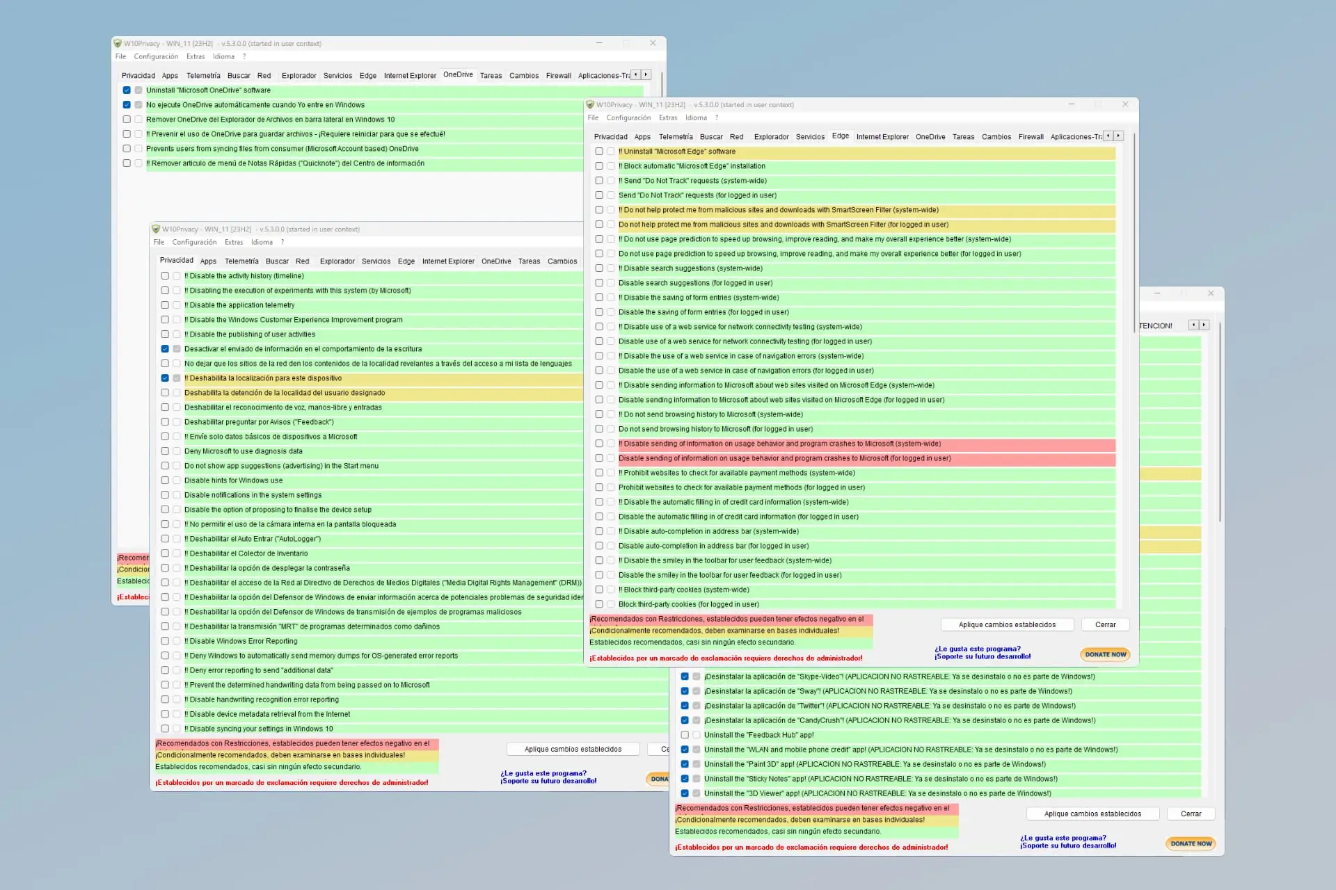 En su página oficial, dedica un amplio espacio a explicar cómo funciona la aplicación. Sin embargo, es bastante intuitiva. Algunas de las opciones que quieras cambiar necesitan privilegios de administrador, de manera que tendrás que iniciar W10Privacy en ese modo. Y como suele ser habitual en este tipo de aplicaciones, procura no tocar aquello que no sepas para qué sirve. En este sentido, puedes guardar los cambios en un archivo desde el menú Configuración y así deshacerlos si te dan algún problema con el funcionamiento normal de Windows. Y la propia app te va indicando, con un código de colores, qué funciones requieren de más atención para evitar sorpresas.