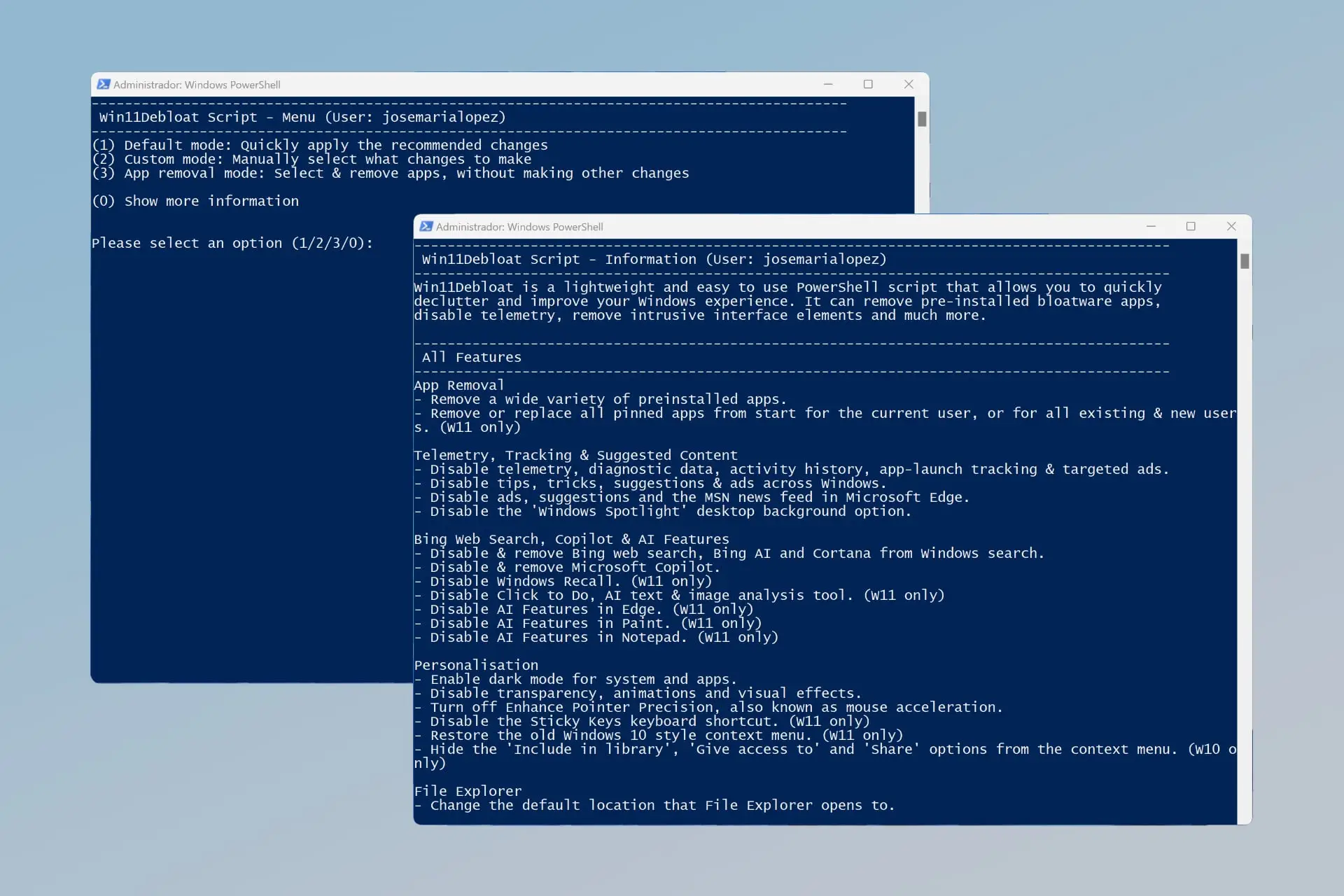Si quieres limpiar Windows 11 de aplicaciones instaladas por defecto, telemetría, bloatware y otros aspectos controvertidos que vienen activados cuando instalas este sistema operativo, Win11Debloat es una posible solución en forma de script para PowerShell. Y pese a no contar con una interfaz gráfica con botones y menús, desde la línea de comandos te guiará para que elijas qué quieres activar o desactivar. Además, cuenta con opciones para ahorrarle tiempo y esfuerzo a administradores de sistemas y usuarios avanzados. En especial si manejan varios ordenadores en una red interna.